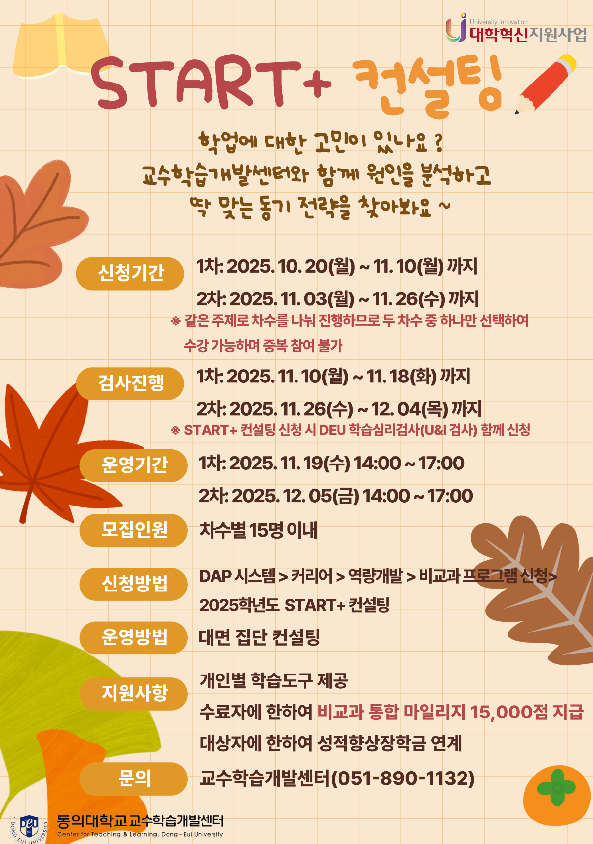 교수학습개발센터의 학습지원 프로그램인 2025학년도 START+ 컨설팅을 다음과 같이 안내하오니 신청 바랍니다.