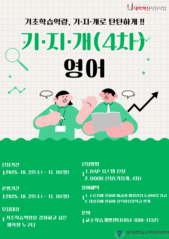 교수학습개발센터에서는 학습지원 프로그램인 2025학년도 기·지·개(기초학문 지식 개선) 4차를 다음과 같이 안내하오니 많은 신청 바랍니다.