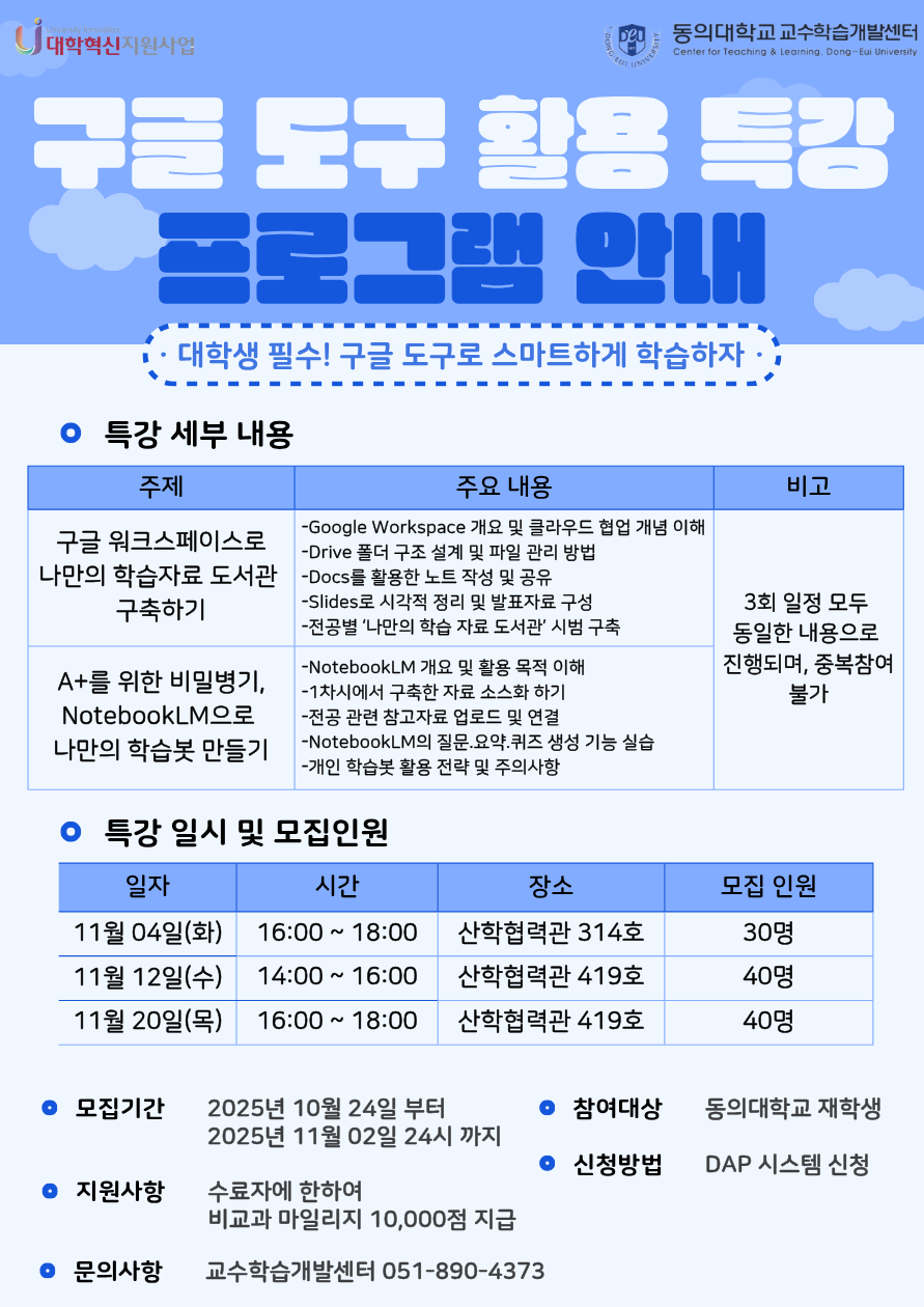 | 구글 워크스페이스로 나만의 학습자료 도서관 구축하기 | -Google Workspace 개요 및 클라우드 협업 개념 이해 -Drive 폴더 구조 설계 및 파일 관리 방법 -Docs를 활용한 노트 작성 및 공유 -Slides로 시각적 정리 및 발표자료 구성 -전공별 ‘나만의 학습 자료 도서관’ 시범 구축 | 3회 일정 모두 동일한 내용으로 진행되며, 중복참여 불가 |